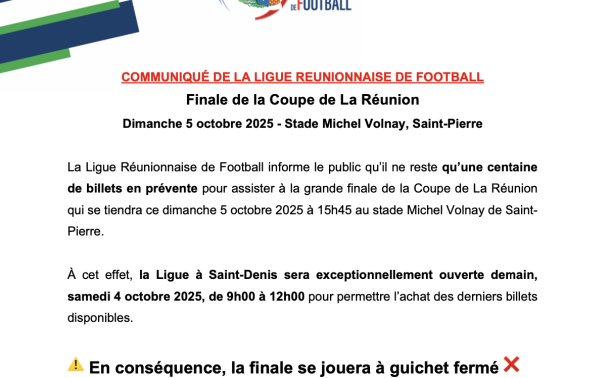 Dans le cadre de l’organisation de la finale de la Coupe de La Réunion prévue ce dimanche 5 octobre 2025 au stade Michel Volnay à Saint-Pierre, la Ligue Réunionnaise de Football porte à la connaissance du public les informations essentielles relatives à la billetterie et à l’accès au stade.