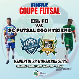 La Coupe Régionale de Futsal ouvrira les festivités ce vendredi à 20h30 au gymnase de Saint-Leu. Le champion de Régional 1, l’ESL FC, sera opposé au SC Futsal Dionysien, sacré en Départemental 1.